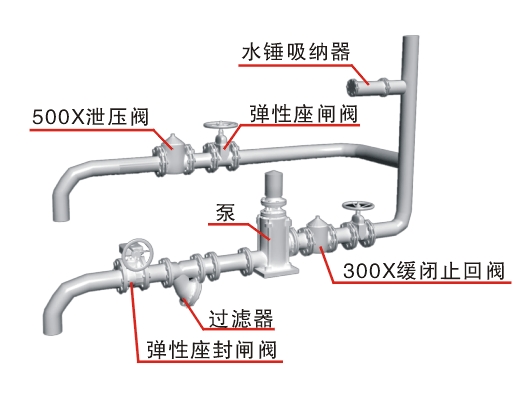 3、當(dāng)揚(yáng)程50m以上,壓力5Kgf/cm2以上時,建議長道管下方及逆止閥止閥上方轉(zhuǎn)角處各安裝一只水錘消除器。